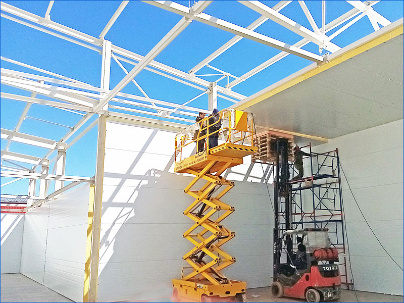 Сэндвич-панель на сегодняшний день – самый экономичный и простой в монтаже тип ограждающей конструкции. В основе строения лежат два слоя оцинкованного металла окрашенные порошковым, либо полимерным способом в любой цвет. Между ними располагается эффективный утеплитель – пенополистирол или минеральная вата (материалы применяются в зависимости от показателя влажности помещения и противопожарных ограничений). Данная конструкция имеет минимальный собственный вес по сравнению с другими типами, что позволяет, порой, даже не учитывать вертикальные нагрузки от их собственного веса при расчёте. Основным минусом панелей является их повышенная деформируемость в случае механического воздействия при транспортировке, монтаже и эксплуатации, так как толщина стали редко превышает 0.5-0.7 мм.